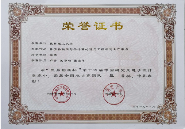 近日,“兆易创新杯”第十四届中国研究生电子设计竞赛全国总决赛在南京信息工程大学举行。本次大赛共吸引来自全国200余所高校的400支队伍参赛,经过现场激烈角逐,评审专家严格评审,最终我校参赛队伍由机械与控制工程学院梁勇老师指导学生卢伟、王泽瑞、张雪琴参赛的“基于物联网与云计算的沼气工程智慧生产平台”作品荣获技术赛全国总决赛三等奖,取得了我校在该赛事的历史性好成绩。同时,我校获全国总决赛优秀组织奖。