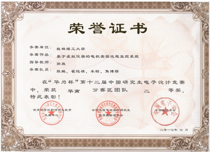 7月17日至18日,为期二天的第十二届“华为杯”中国研究生电子设计大赛华南赛区在广东省深圳大学举行。在研究生院和机械与控制工程学院的大力支持下,在参赛学生与指导教师的共同努力下,机械与控制工程学院参赛作品《基于虚拟仪器的电机实验远程监控系统》荣获二等奖(指导教师:孙旋,参赛研究生:熊鹏、翟恺祺、焦博隆、车轲)。这是我院学子首次参加第十二届“华为杯”中国研究生电子设计大赛(华南赛区)。