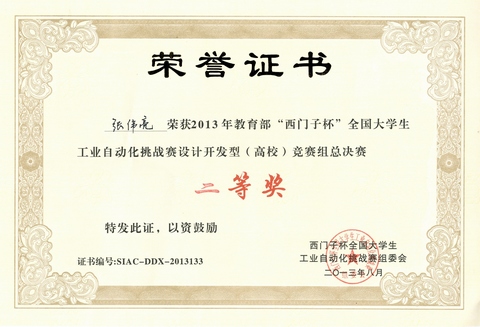 8月22日,为期四天的2013年“西门子杯”全国大学生工业自动化挑战赛总决赛在上海应用技术学院奉贤校区圆满落幕。我院代表学校首次组队参赛的“腾飞前线”队(队员:黄高翔、张伟亮,指导教师:陈明霞)进入总决赛并取得了“设计开发组(高校)”竞赛组二等奖的好成绩,填补了我校在该项赛事中的空白。