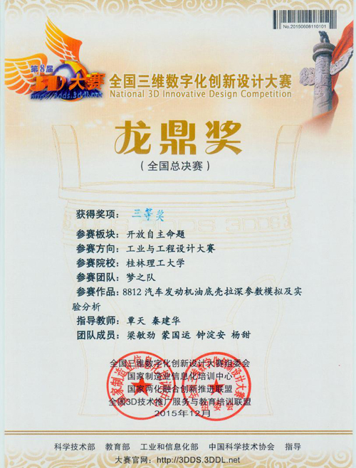 在学校关心和大力支持下,我院今年首次组队参加了该项赛事,其中“梦之队”代表队获得开放自主命题工业工程组全国总决赛三等奖(组队学生:梁敏劲、蒙国运、钟淀安、杨甜,指导教师:覃天、秦建华),为学校争得了荣誉。此外,我院学子还在广西赛区竞赛中获得二等奖2项,三等奖1项的好成绩,其中一件作品还获得最佳网络评价奖。