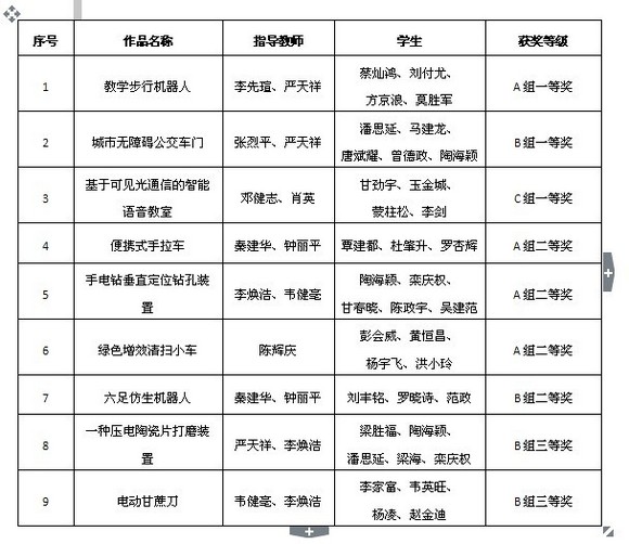 11月中旬,由广西壮族自治区教育厅主办,桂林电子科技大学承办的第四届广西高校大学生创新设计与制作大赛在桂林电子科技大学体育馆落下帷幕。本届比赛共有全区32个高校代表队的284件参赛作品参与了大赛角逐。机械与控制工程学院组队代表我校参加了此次大赛。经过专家的认真评审,我校参赛代表队共获得3个一等奖,4个二等奖和2个三等奖,并获得本届大赛的优秀组织奖。(其中:A组机械制作类获一等奖1个,二等奖3个;B组机电结合类获一等奖1个,二等奖1个,三等奖2个;C组创意设计类获一等奖1个。)