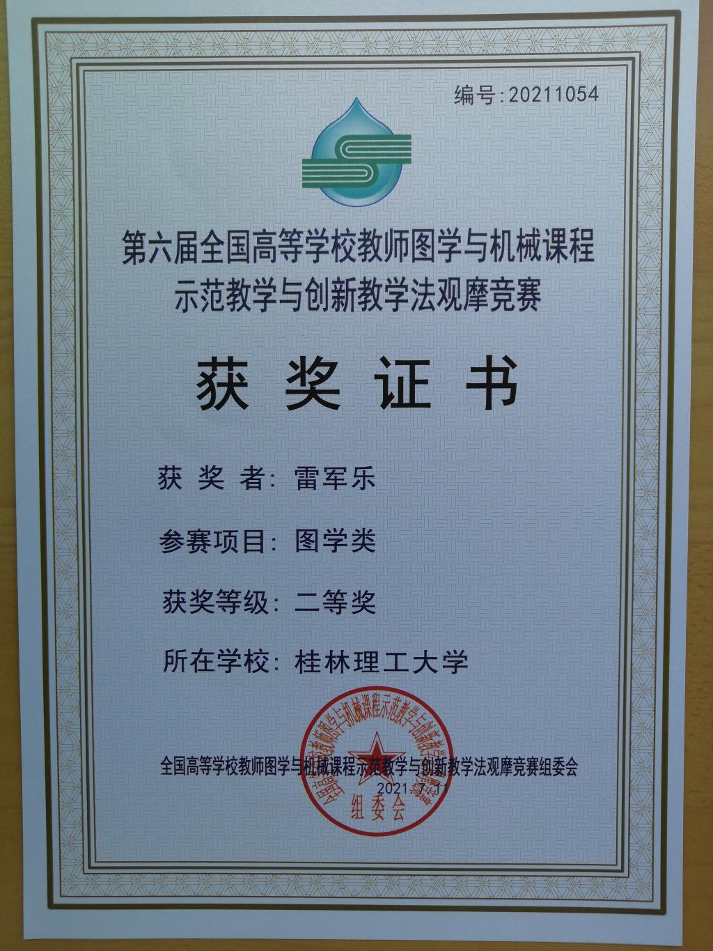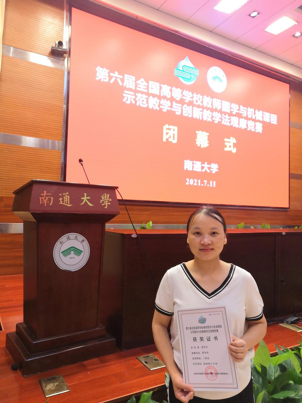7月9日至11日,第六届全国高等学校教师图学与机械课程示范教学与创新教学法观摩竞赛在南通大学举行,我校机械与控制工程学院雷军乐老师荣获大赛二等奖。