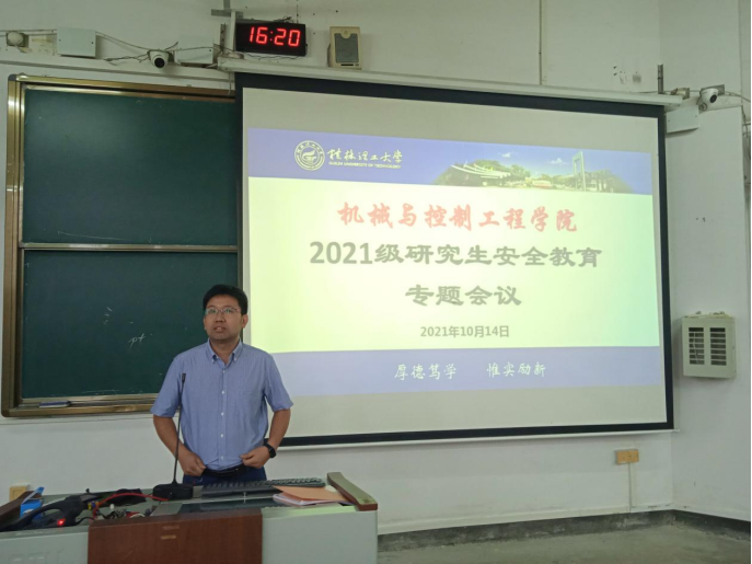 为加强安全教育,提高同学们的安全意识,10月15日下午,机械与控制工程学院在05103教室召开2021级研究生安全教育专题会议,会议由学院研究生辅导员马文硕老师主持,学院党委副书记王迎波、学院副院长孙旋出席会议并讲话,2021级全体研究生参加了此次会议。