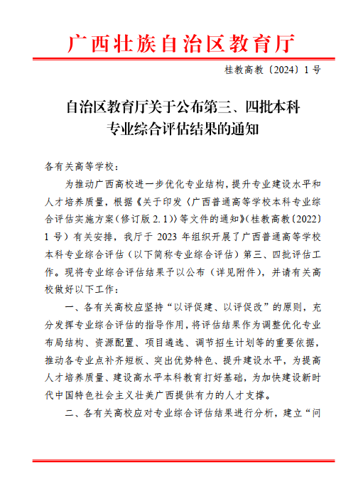 日前,广西壮族自治区教育厅印发《自治区教育厅关于公布第三、四批本科专业综合评估结果的通知》(桂教高教〔2024〕1号),我院机械电子工程专业通过广西普通高等学校本科专业综合评估,并获评为四星级专业。
