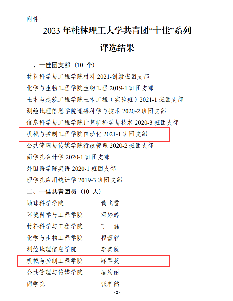 近日,在学校公布的《关于2023年桂林理工大学共青团“十佳”系列评选结果的公示》评选结果中,我院团委书记黎云鹏荣获“十佳共青团干部(教师)”、自动化2021-1班团支部荣获“十佳团支部”、2019级学生张荣康荣获“十佳科技活动先进个人”、2020级学生麻军英荣获“十佳共青团员”、2020级学生赖文泳荣获“十佳文体活动先进个人”。