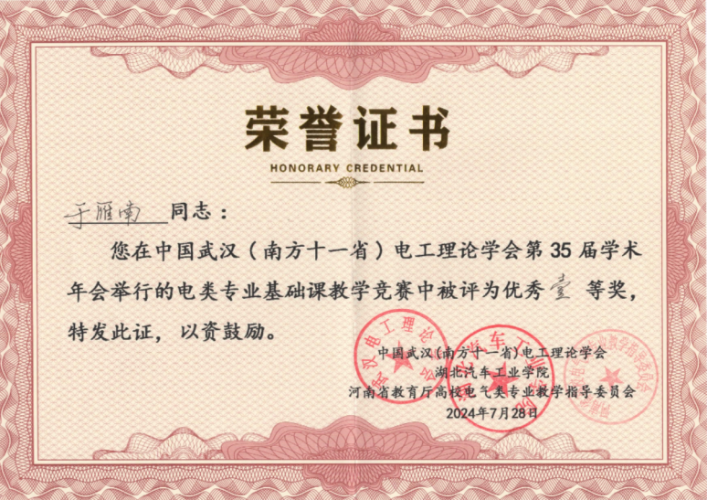 7月28日,中国武汉(南方十一省)电工理论学会教学竞赛决赛在湖北汽车工业开云官方端网站登录入口,我院于雁南老师和石荣亮老师分别荣获教学竞赛一、二等奖。
