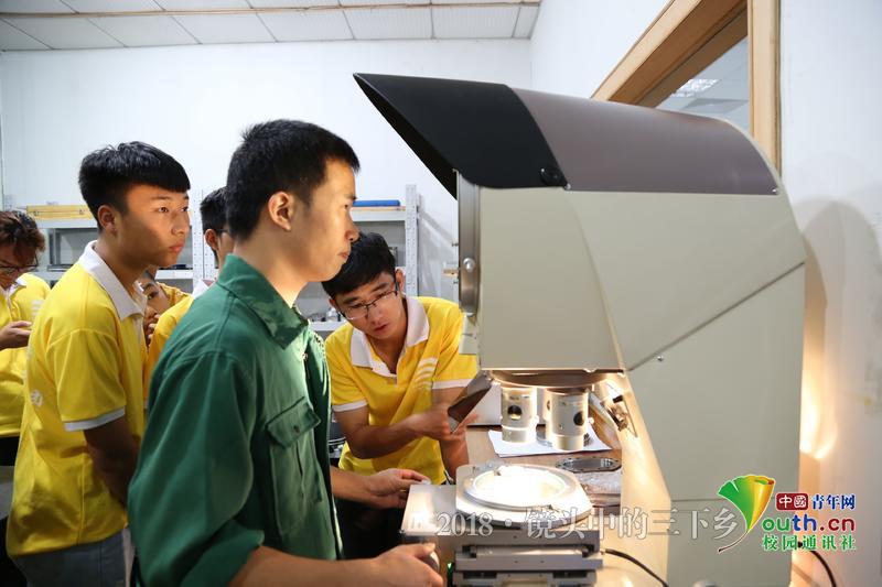 实践团成员学习通过投影放大设备对零件微小部位放大测量操作。 中国通讯员 孔佑鹏 摄