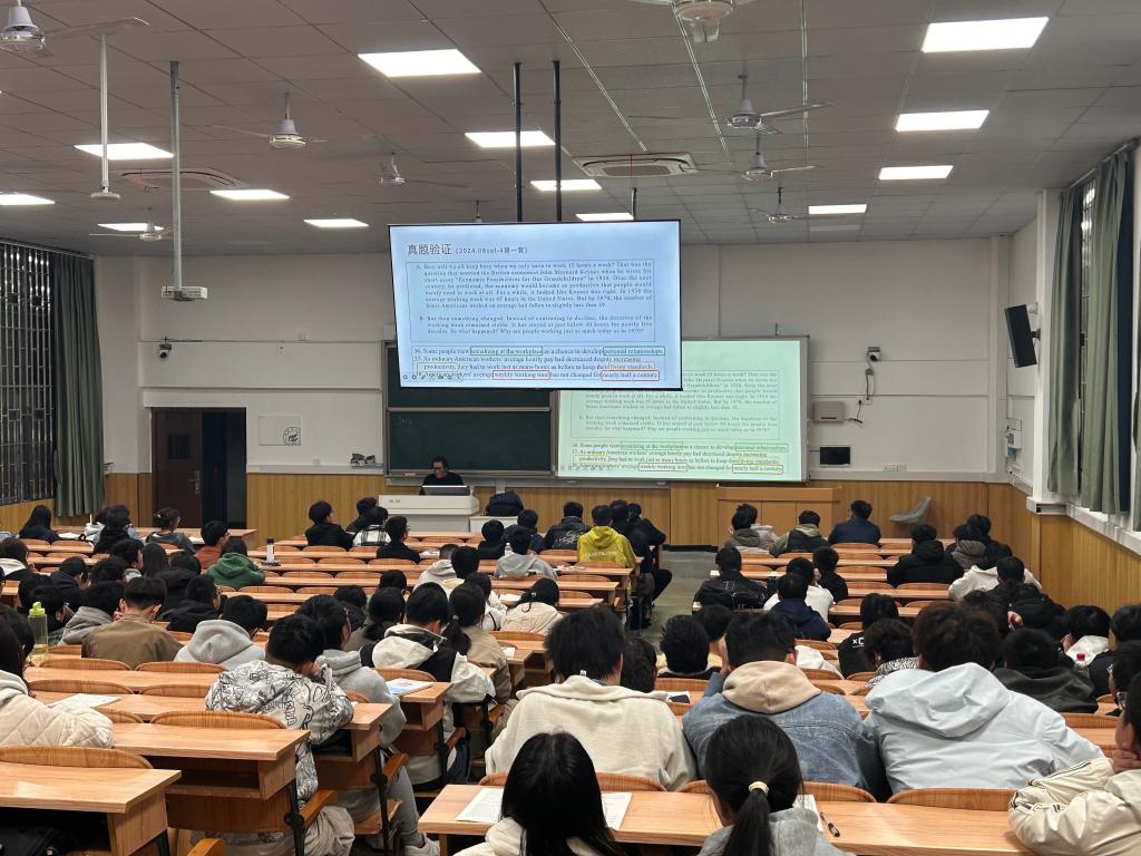 讲座过程中,张老师深入剖析了大学英语四级作文的评分标准与要求,从内容构思、结构布局到语言表达等方面进行了系统讲解。通过对比分析历年真题范文,张老师详细阐释了高分作文的写作要点,并现场演示了从审题立意、段落构建到语言润色的完整写作流程。在实践教学环节,张老师特别选取了往届学生的典型习作案例,通过现场修改示范,生动展示了如何提升作文质量的具体方法。整场讲座内容翔实,逻辑严谨,学生们积极参与互动交流。