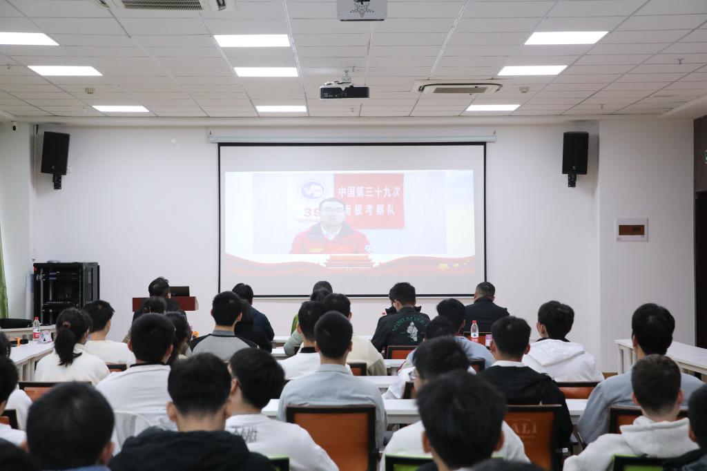 随后,我院南极科考队员周祥老师与同学们视频连线寄语。周老师介绍了国家南极科考的重大意义和南极科考站的建设情况,向同学们分享了自己在南极学习、工作、生活的有关情况。周老师结合自身求学经历,勉励大家坚定不移听党话、跟党走,怀抱梦想又脚踏实地,敢想敢为又善作善成,立志做有理想、敢担当、能吃苦、肯奋斗的新时代好青年,让青春在全面建设社会主义现代化国家的火热实践中绽放绚丽之花,也期待大家加入我国的科研和科考队伍。