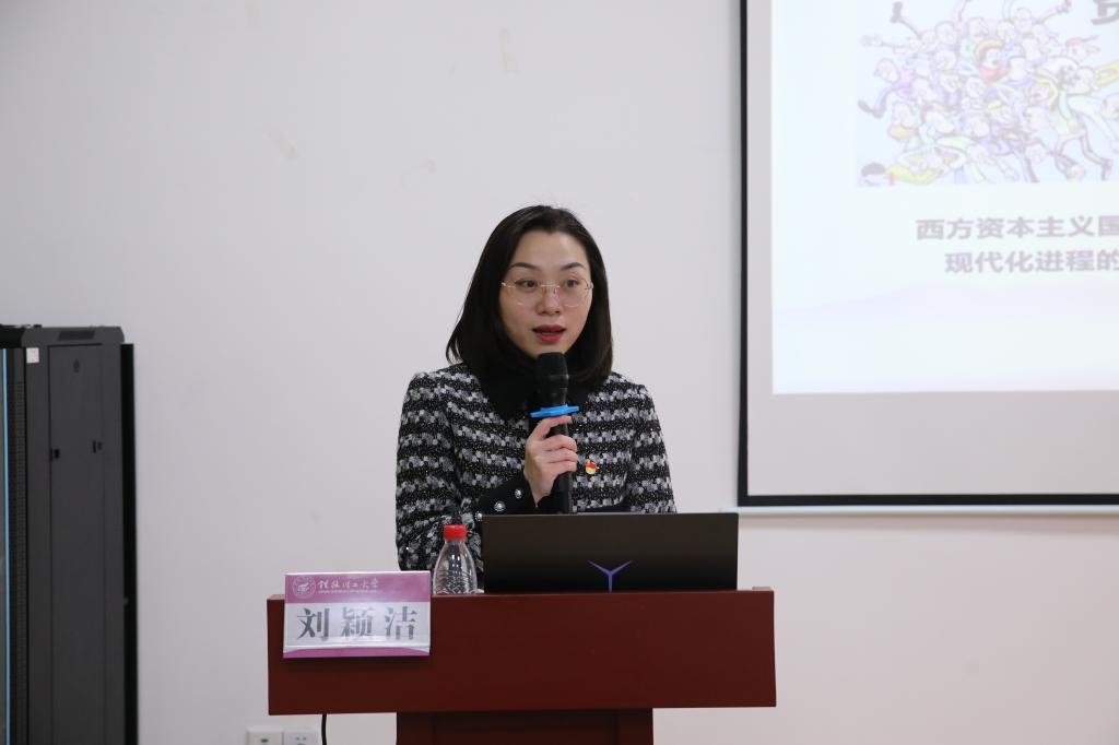 紧接着,广西青年讲师团成员、党的二十大精神宣讲团成员、马克思主义学院刘颖洁老师以《让青春在全面建设社会主义现代化国家的火热实践中绽放绚丽之花》为题,从中国波澜壮阔的现代化进程、中国奔赴现代化坐标的青春力量、中国式现代化道路上的青年担当三个方面进行讲授为师生们带来一堂生动有味的微党课。