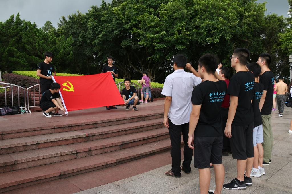 上午8点30分,实践团成员提着沉甸甸的花篮,行走在蜿蜒盘旋的山路上,经过20多分钟的路途来到莲花山公园山顶。青松翠柏间,邓小平铜像广场显得庄严肃穆。上午9时,实践团成员迈着坚定有力的步伐,护送2个花篮走到邓小平同志铜像前,轻轻放下。花篮的红色缎带上写着“深切缅怀改革开放总设计师邓小平同志”17个大字,寄托着对邓小平同志的无限敬仰和无尽怀念。实践团成员神情庄重、俯下身体,伸出双手仔细整理花篮上的红色缎带。随后,全场肃立,向邓小平同志铜像三鞠躬。敬献花篮仪式后,黎云鹏老师带领全体师生党员、积极分子面向邓小平同志铜像,在鲜艳的党旗前,郑重地重温了一遍入党誓词。