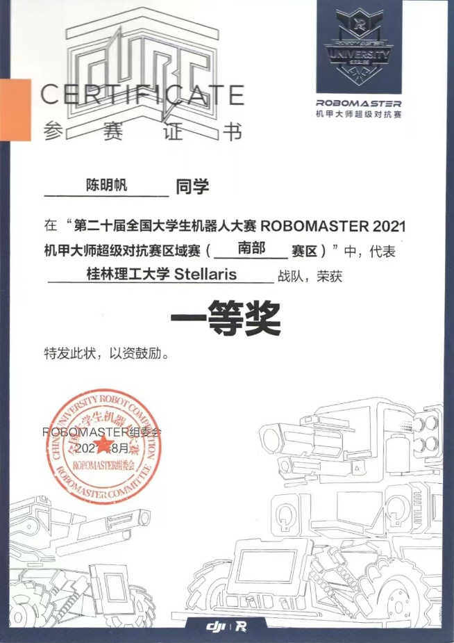 1、第二十届全国大学生机器人大赛 ROBOMASTER 2021 机甲大师全国赛一等奖;
