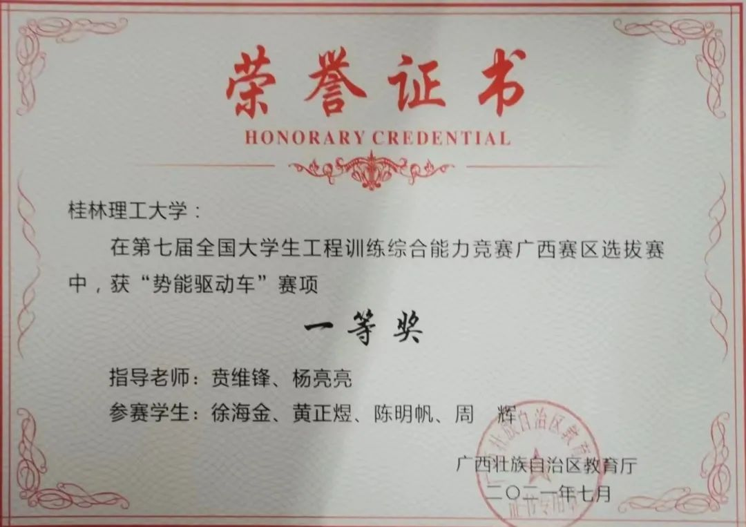 3、第七届全国大学生工程训练综合能力竞赛广西赛区选拔赛“势能驱动车赛项”一等奖;